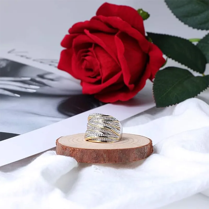 Rawatan permukaan bertekstur dan licin: Bahagian perak mempunyai tekstur yang dinaikkan, manakala bahagian emas adalah licin. Cincin fesyen wanita aloi mencipta kesan kontras dinamik secara visual dan sentuhan, menonjol di antara banyak cincin.