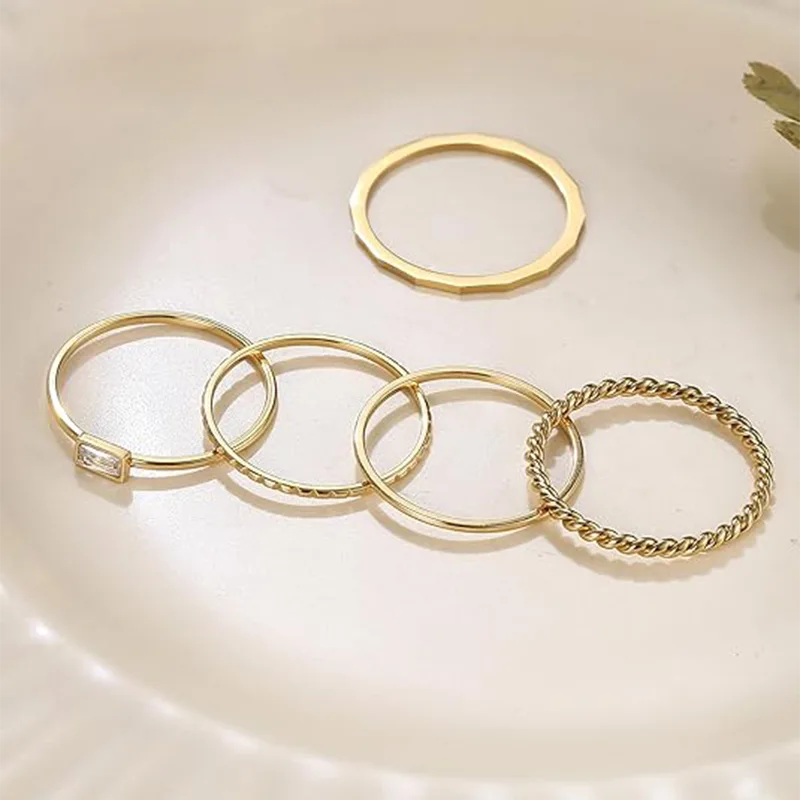 Cincin wanita boleh susun ringkas - Tunjukkan gaya anda - Set cincin emas dan perak ini mengandungi lima cincin ultra nipis dan indah, dengan pelbagai gaya dan reka bentuk yang ringkas. Dipakai bersendirian, mereka boleh mencipta penampilan yang elegan dan ringkas, atau dipakai bersama untuk mempamerkan gaya berani. Sempurna untuk menyusun, mencampur dan memadankan, dan pilihan penggayaan!